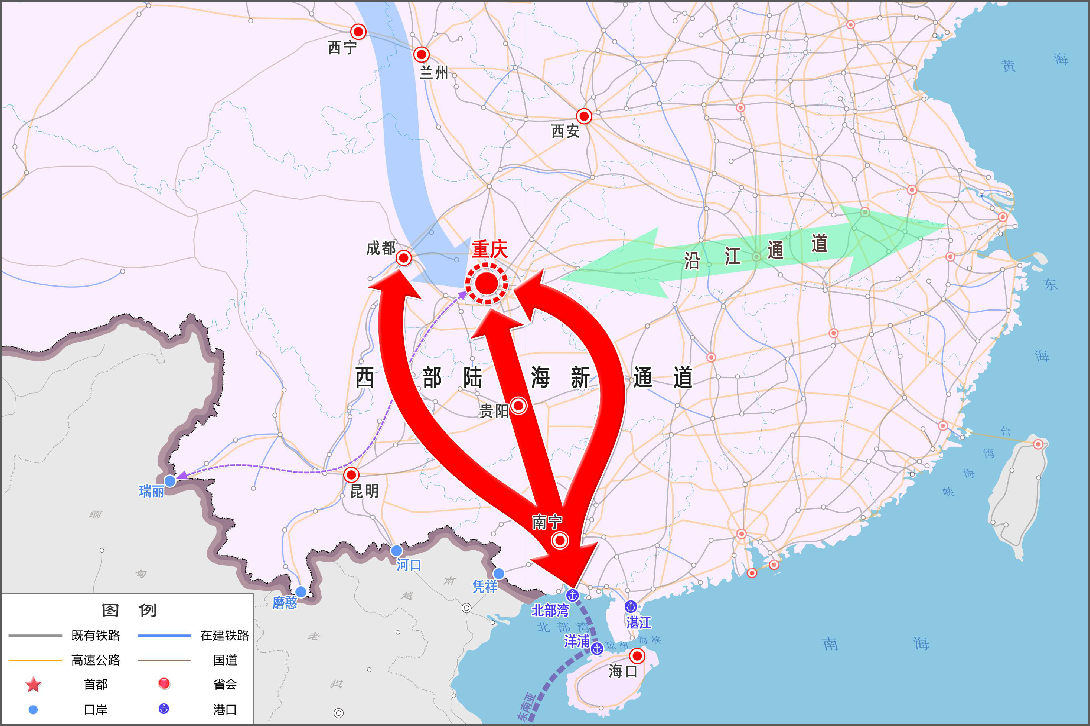 重要樞紐。著力打造國際性綜合交通樞紐,充分發(fā)揮重慶位于“一帶一路”和長(zhǎng)江經(jīng)濟(jì)帶交匯點(diǎn)的區(qū)位優(yōu)勢(shì),建設(shè)通道物流和運(yùn)營組織中心;發(fā)揮成都國家重要商貿(mào)物流中心作用,增強(qiáng)對(duì)通道發(fā)展的引領(lǐng)帶動(dòng)作用。建設(shè)廣西北部灣國際門戶港,發(fā)揮海南洋浦的區(qū)域國際集裝箱樞紐港作用,提升通道出海口功能。