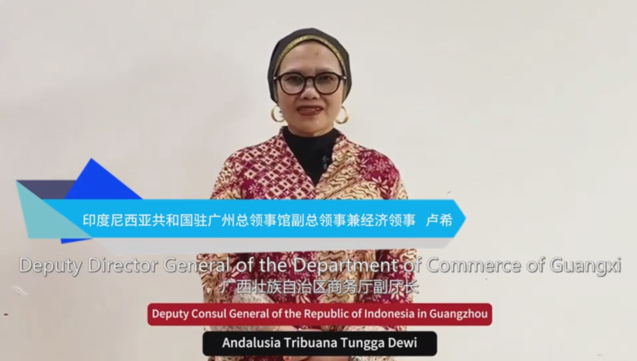 ▲盧希副總領(lǐng)事在視頻致辭中表示,包括廣西在內(nèi)的華南地區(qū)在促進(jìn)印尼與中國建立更緊密、更深層次關(guān)系方面發(fā)揮著關(guān)鍵作用。清真市場為印尼與廣西之間的合作,包括在東盟框架內(nèi)的合作提供了巨大的機會。今年是印尼和中國建交75周年,中印尼兩國政府致力于進(jìn)一步加強伙伴關(guān)系。為此,她希望這次活動能夠取得更加具體的成果,造福兩國人民。