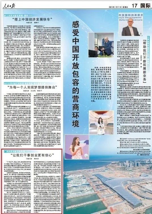 1月11日,《人民日報》第17版刊登《感受中國開放包容的營商環(huán)境》的報道。得益于中國(廣西)自由貿(mào)易試驗區(qū)的快速發(fā)展,外國投資者切身感受著開放包容的營商環(huán)境和蓬勃發(fā)展的機(jī)遇,加速在當(dāng)?shù)氐脑鲑Y進(jìn)資。其中采訪了廣西新中產(chǎn)業(yè)投資有限公司董事長趙海燕,相關(guān)報道摘錄如下: